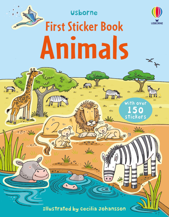 irst Sticker Book Animals este o carte din seria Usborne First Sticker Books, concepută pentru copiii mici care iubesc animalele și activitățile creative. Conform descrierii oficiale Usborne, cartea include peste 150 de autocolante și prezintă „zeci de animale diferite” pe care copiii le pot descoperi în scene precum deșertul, savana africană și pădurea tropicală .
