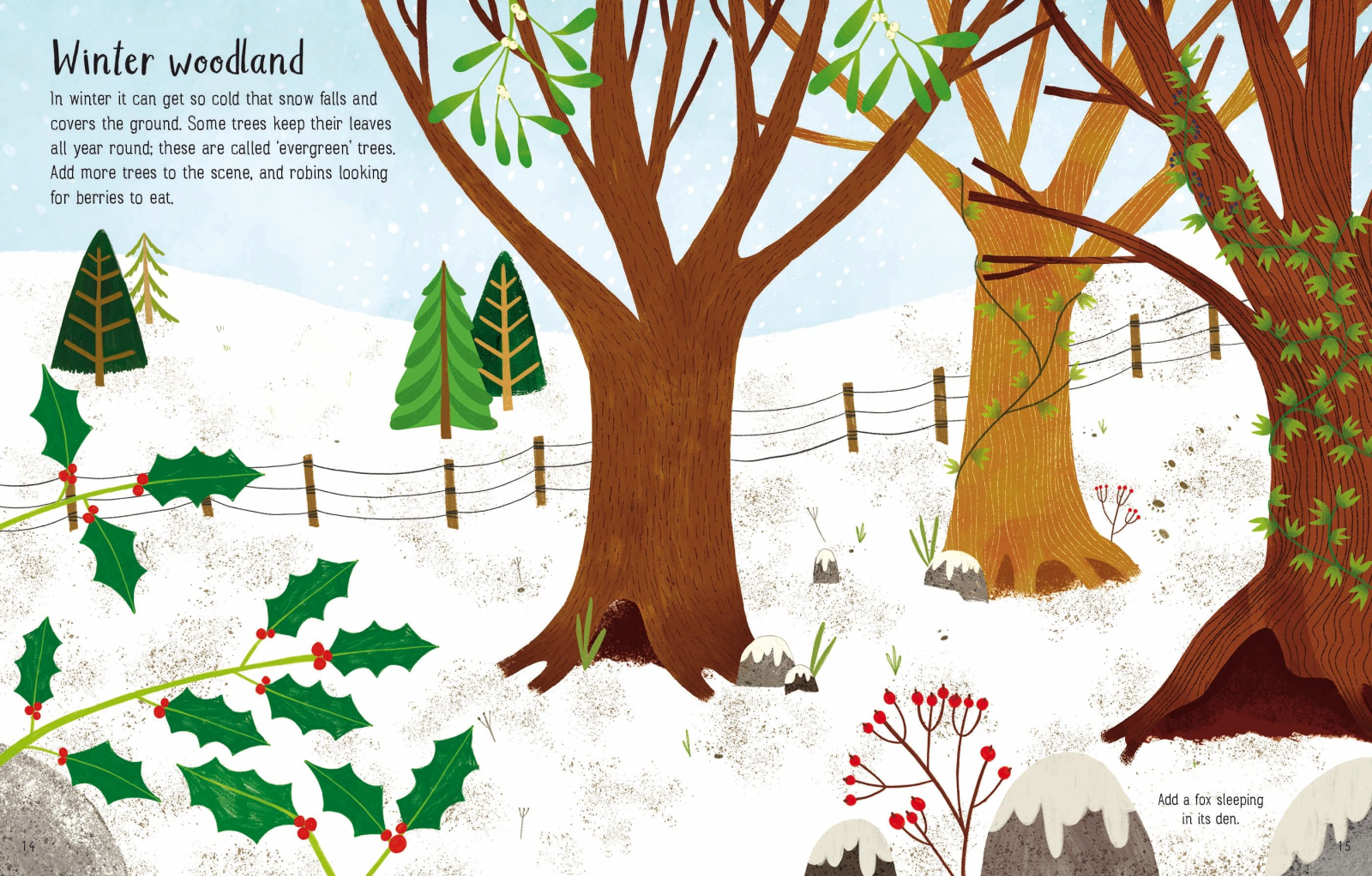 Cei mici pot completa scene de primăvară pline de flori și pui de animale, pagini de vară cu plajă și picnicuri, peisaje de toamnă cu frunze colorate și activități de iarnă precum săniușul sau împodobirea bradului. Ilustrațiile sunt luminoase, prietenoase și concepute pentru a stimula imaginația, vocabularul și înțelegerea ciclului naturii.