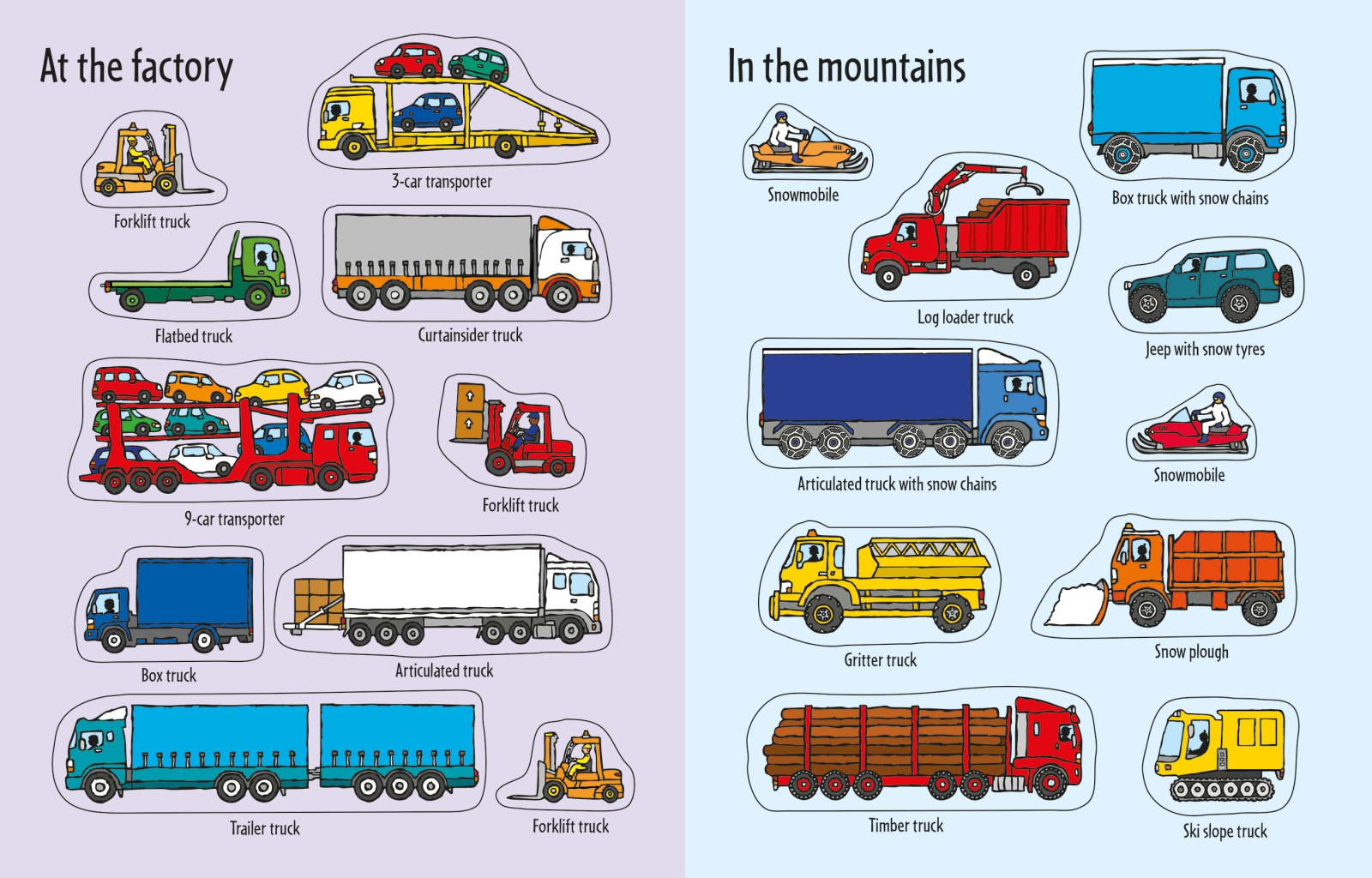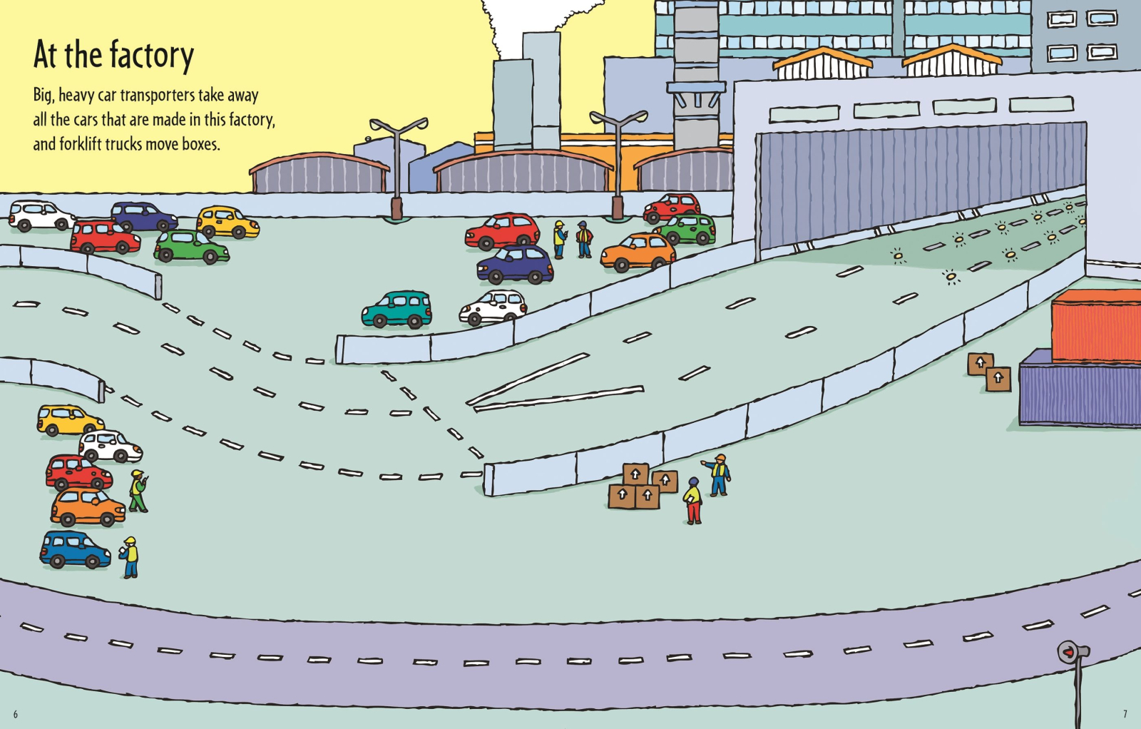 Scenele acoperă un șantier aglomerat, un oraș plin de activitate, o autostradă și chiar munți înzăpeziți, conform descrierii oficiale Usborne