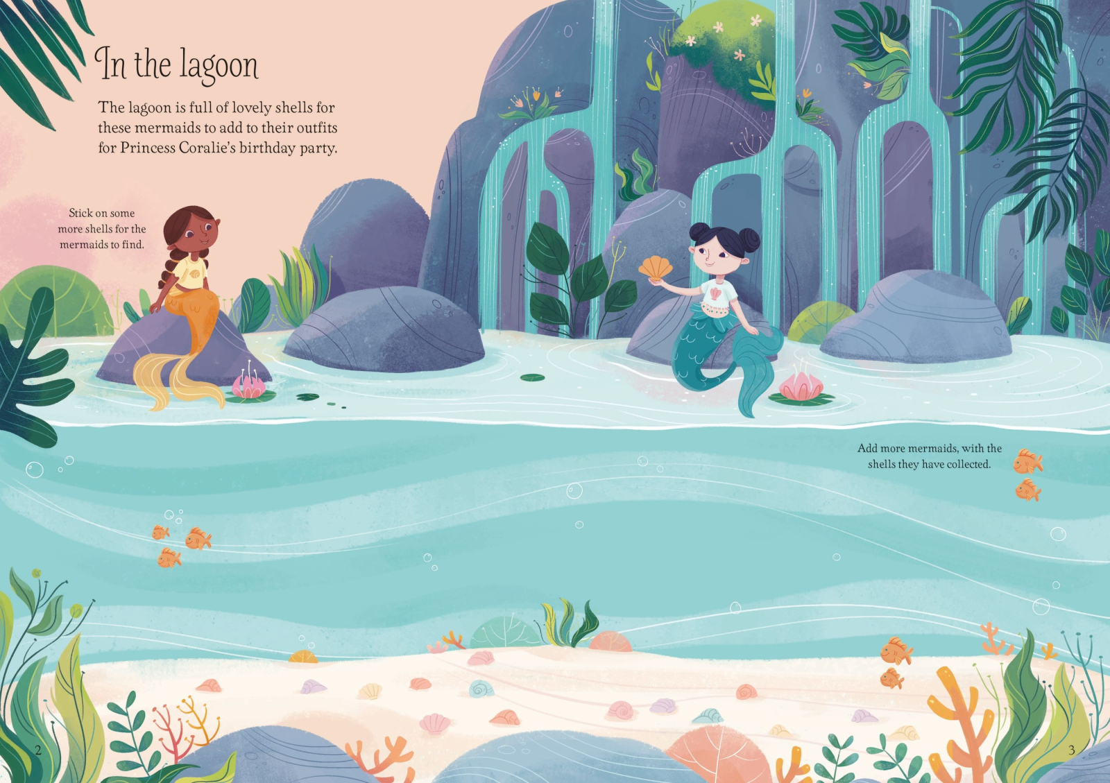 Cei mici pot completa scene ilustrate cu lagune strălucitoare, recife de corali, peșteri subacvatice, petreceri ale sirenelor și aventuri în adâncuri. Ilustrațiile sunt luminoase, delicate și pline de detalii care stimulează imaginația, coordonarea mână–ochi și creativitatea.