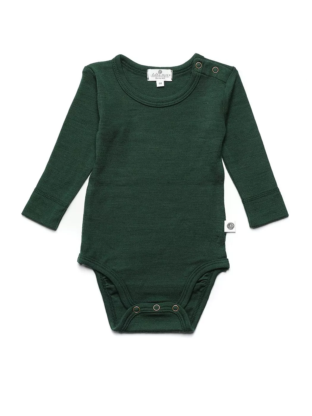 Body cu mânecă lungă din lână merinos, nuanța Mountain, de la Lille Barn. Moale, respirabil și ideal pentru menținerea temperaturii optime a corpului în orice sezon.